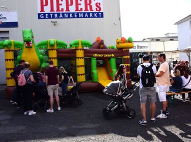 Alle Tischreihen waren besetzt und wer Lust hatte, konnte sich bei Juwelier Reiffert noch schnell über dessen erweiterte Angebotspallette vorabinformieren. In Kürze eröffnet die Firma Reiffert ihr neugestaltetes Uhrengeschäft an der Siegesstraße. Die Spedition Wirtz war mit ihrem Riesentruck und Oldtimern stark vertreten. Hier konnten sich Interessierte über das Arbeitsfeld eines Lkw-Berufsfahrer informieren. Die Kinder durften ins Lkw-Führerhaus klettern, staunten über die Größe der dortigen Schlafkabine und bewunderten die Fernsicht vom Fahrersitz aus. Eine Riesenhüpfburg mit Namen DINO lockte viele unserer jungen Gäste an, die ausgiebig dort nach Herzenslust toben konnten.
