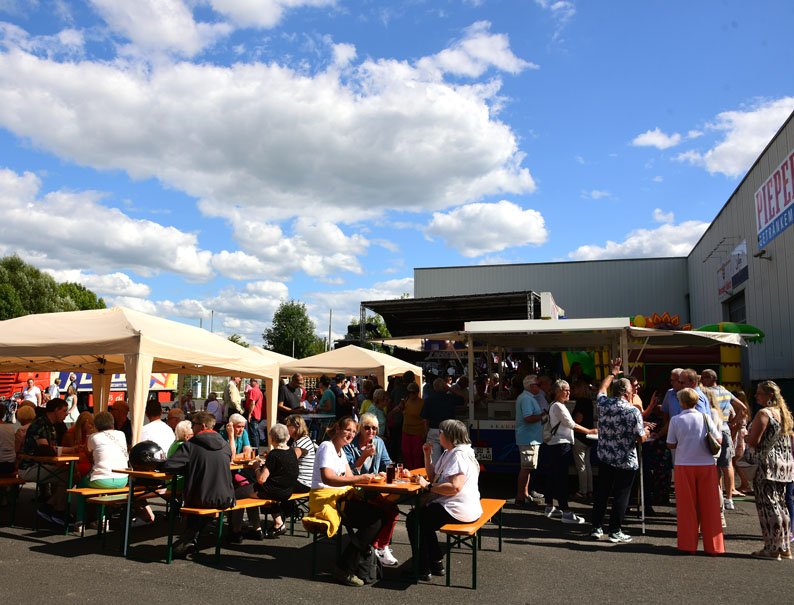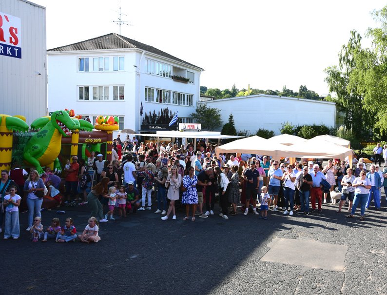 Alle Tischreihen waren besetzt und wer Lust hatte, konnte sich bei Juwelier Reiffert noch schnell über dessen erweiterte Angebotspallette vorabinformieren. In Kürze eröffnet die Firma Reiffert ihr neugestaltetes Uhrengeschäft an der Siegesstraße. Die Spedition Wirtz war mit ihrem Riesentruck und Oldtimern stark vertreten. Hier konnten sich Interessierte über das Arbeitsfeld eines Lkw-Berufsfahrer informieren. Die Kinder durften ins Lkw-Führerhaus klettern, staunten über die Größe der dortigen Schlafkabine und bewunderten die Fernsicht vom Fahrersitz aus. Eine Riesenhüpfburg mit Namen DINO lockte viele unserer jungen Gäste an, die ausgiebig dort nach Herzenslust toben konnten.