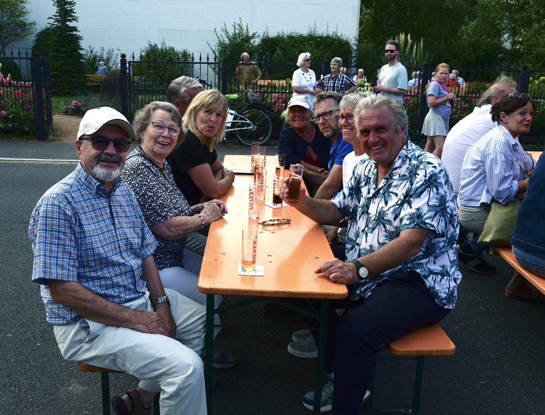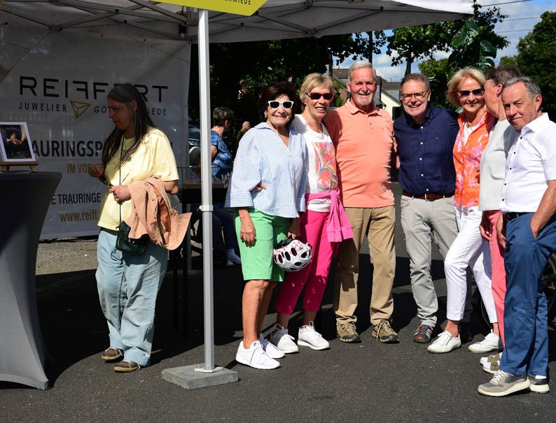 Mit zünftiger Blasmusik eröffneten die Roisdorfer Musikfreunde unter einem weiß-blauen Himmel das diesjährige Gewerbefest des Roisdorfer Gewerbevereins. Viele Roisdorfer und weitere Gäste zog es an diesem schönen Sonntagnachmittag in den Brunnenpark, um im Schatten der Bäume der Musik zu lauschen und es sich im Garten-Café Nelles bei einem frischen Kaffee und leckerem Kuchen gut gehen zu lassen. Hier konnten die Vorstandsmitglieder Harald Stadler, Bernhard Haberl und Astrid Anders, den Bäckermeister Herbert Nelles (3. v. l.) begrüßen, der 1984 als einer der Gründungsväter des Gewerbevereins extra zum 40ig-jährigen Geburtstagsfest der Roisdorfer Unternehmer gekommen war.